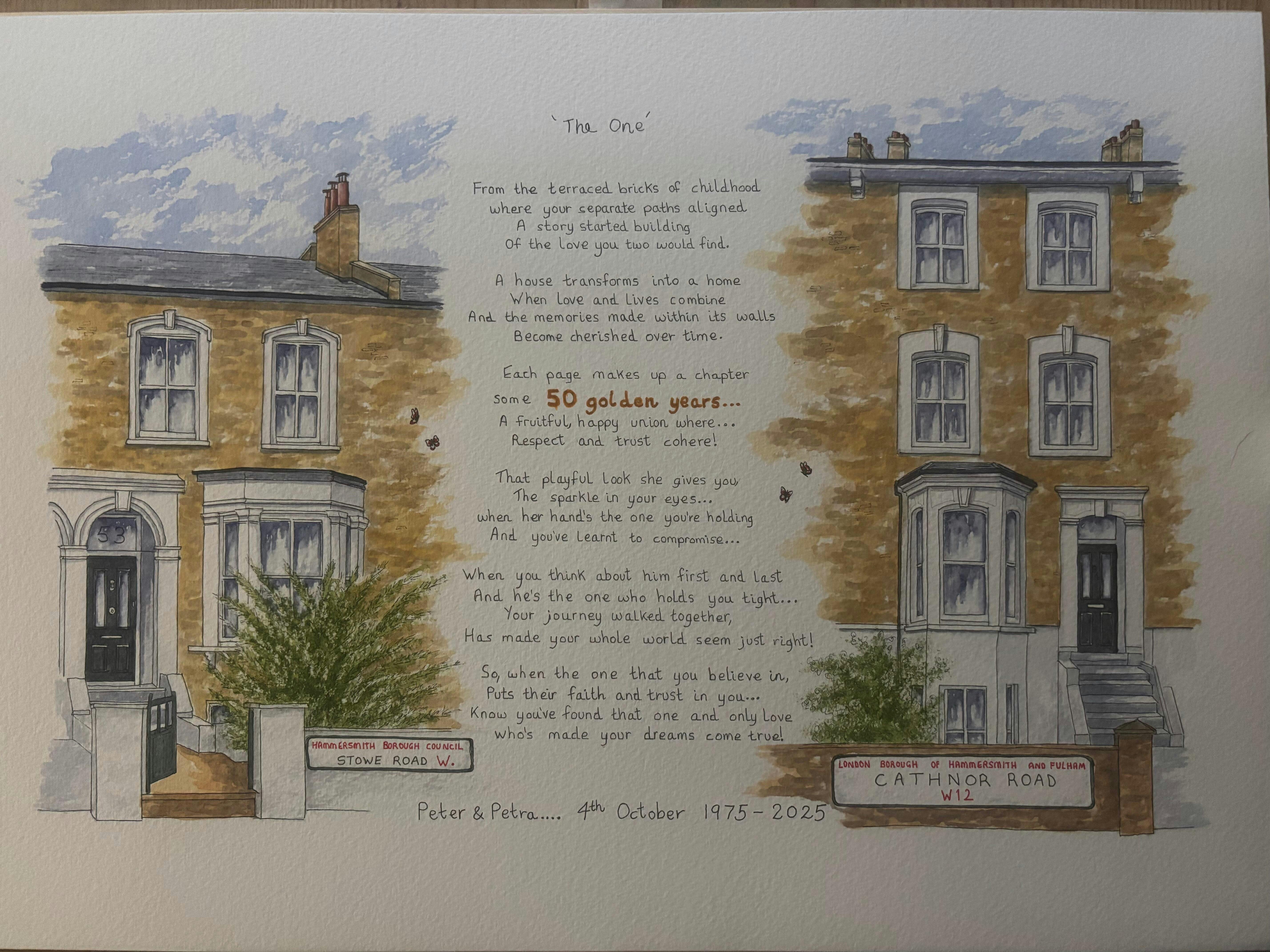 A3 custom watercolour artwork to include two houses with street signs and poem. Scaling and layout included.